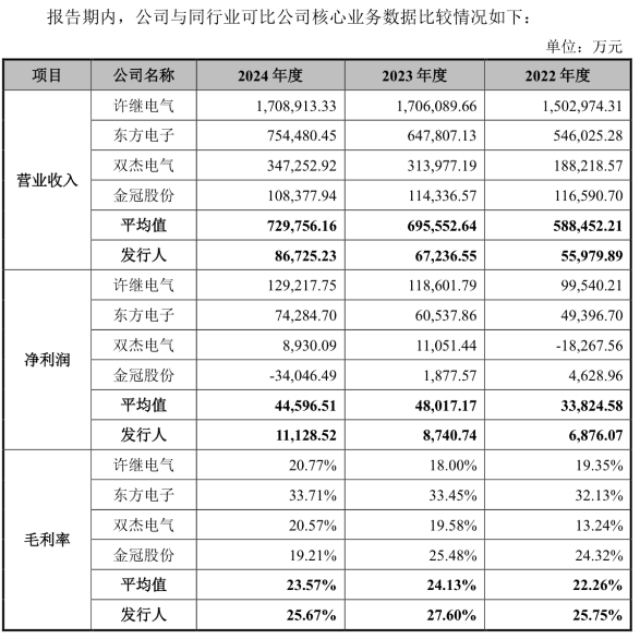 2022-2024年,昊创瑞通营业收入分别为55,979.89万元、67,236.55万元和86,725.23万元,净利润分别为6,876.07万元、8,740.74万元和11,128.52万元。同行业可比公司平均营业收入分别为588,452.21万元、695,552.64万元和729,756.16万元,平均净利润分别为33,824.58万元、48,017.17万元和44,596.51万元,公司营业收入和净利润规模小于同行业可比公司平均水平。