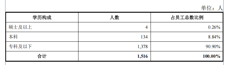 报告显示,截至2024年,公司拥有人员共计1516人,研发技术人员181人,占员工总人数的11.94%。其中,硕士以上学历仅4人,大专及以下学历1378人。且低学历人员任职公司及子公司研发部技术总监、研发部经理等要职。而高新企业认定条件之一就是“具有大学专科以上学历的科技人员占企业当年职工总数的30%以上”。