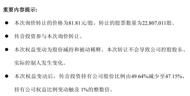 9月12日,公司发布公告称,深圳市传音投资有限公司(以下简称“传音投资”)因自身资金需求,通过询价转让减持2280.7万股,占公司总股本的比例约为2%,转让价格为81.81元/股,套现18.66亿元。本次权益变动后,传音投资持有公司股份比例由49.64%减少至47.15%。