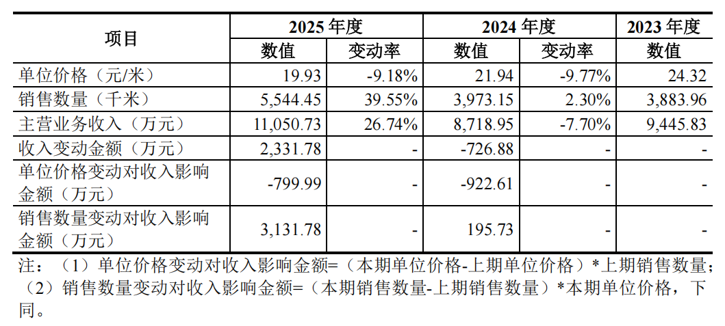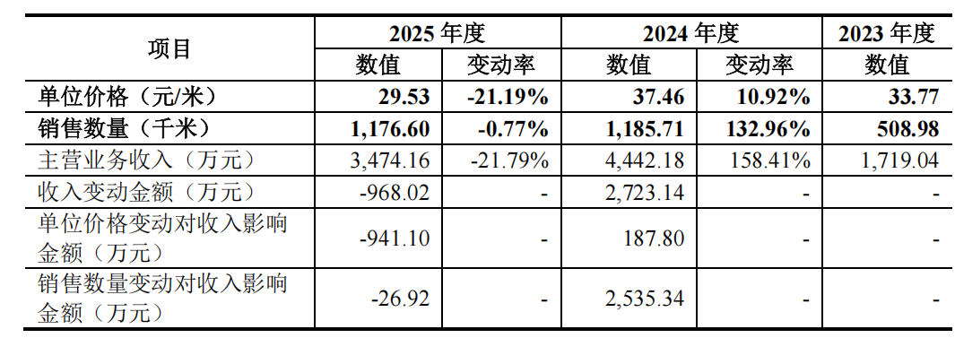 而近两年贡献收入呈现快速增长的、应用于光通讯领域的掺铒光纤,销售量大增的同时,价格降幅也颇大,2025年同比降幅超过21%,预计该产品未来对公司整体毛利率贡献也不会出现额外的助力。