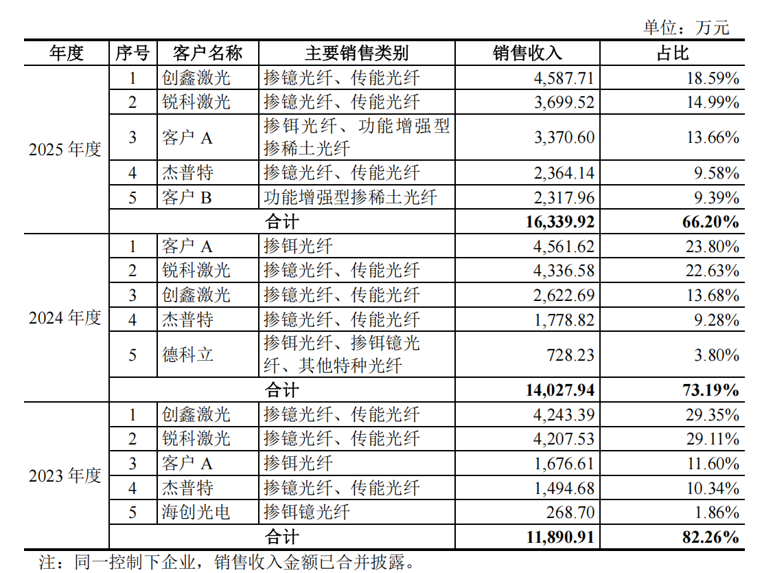 《招股书》显示,2023年至2025年,长进光子向前五大客户合计销售收入占当期营业收入的比例分别为82%、73%、66%。