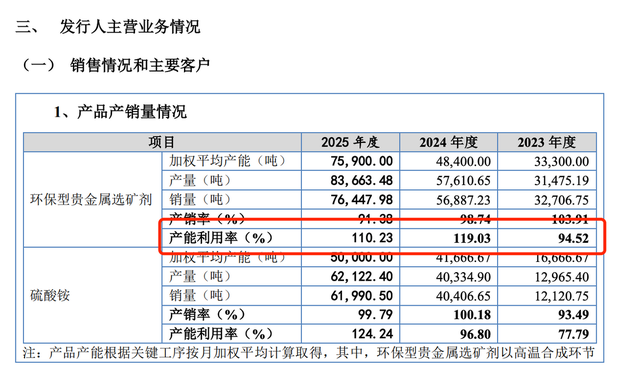 北交所问询函披露,2023年至2025年,森合高科环保型选矿剂产能利用率分别高达94.52%、119.03%和110.23%,持续处于超产状态。