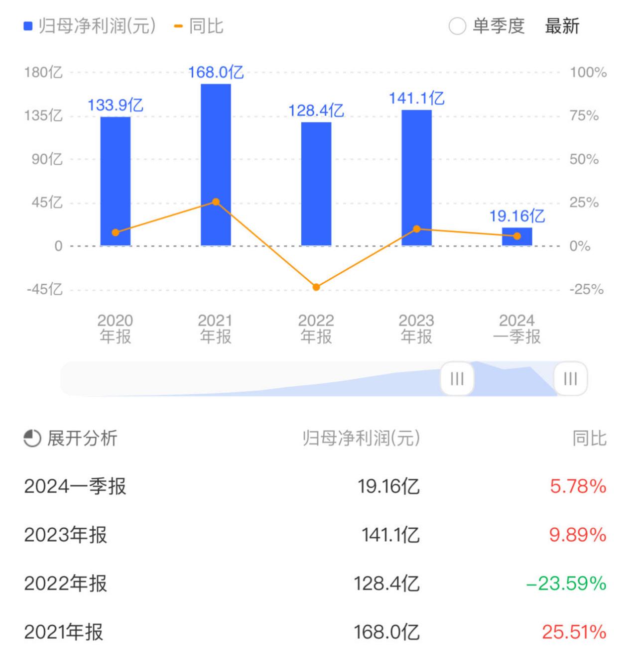 从2022年开始,海康威视净利润首次出现同比负增长,此后净利润开始走低。从数据对比来看,2021年,海康威视实现归母净利润168.0亿元,同比增长25.51%;2022年,实现归母净利润128.4亿元,同比下降23.59%;2023年,实现归母净利润141.1亿元,同比增长9.89%;2024年Q1,实现归母净利润19.16亿元,仅同比微增5.8%。