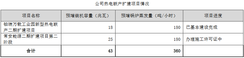 截至2024年6月底,该公司还有2个热电联产扩建项目,分别是铂瑞万载工业园新型热电联产二期扩建项目、常安能源二期扩建项目第二阶段。