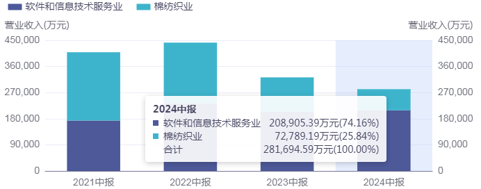 分行业来看,纺织业贡献收入约7.28亿元,同比下降37.88%,该部分收入在总营收中占比25.84%;软件和信息技术服务业贡献收入约20.89亿元,同比增长1.85%,该部分收入在总营收中占比74.16%。