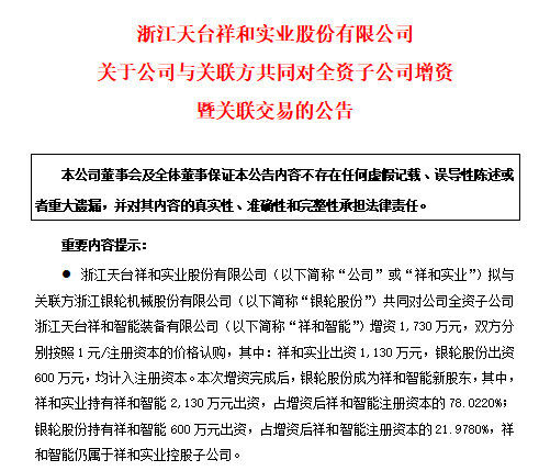近日,祥和实业(603500.SH)一则公告引发市场关注,公司拟与银轮股份共同对全资子公司祥和智能增资1730万元。另一则公告显示,祥和智能拟以600万元受让银轮智能“铁路轨道检测车项目”的所有权利义务。