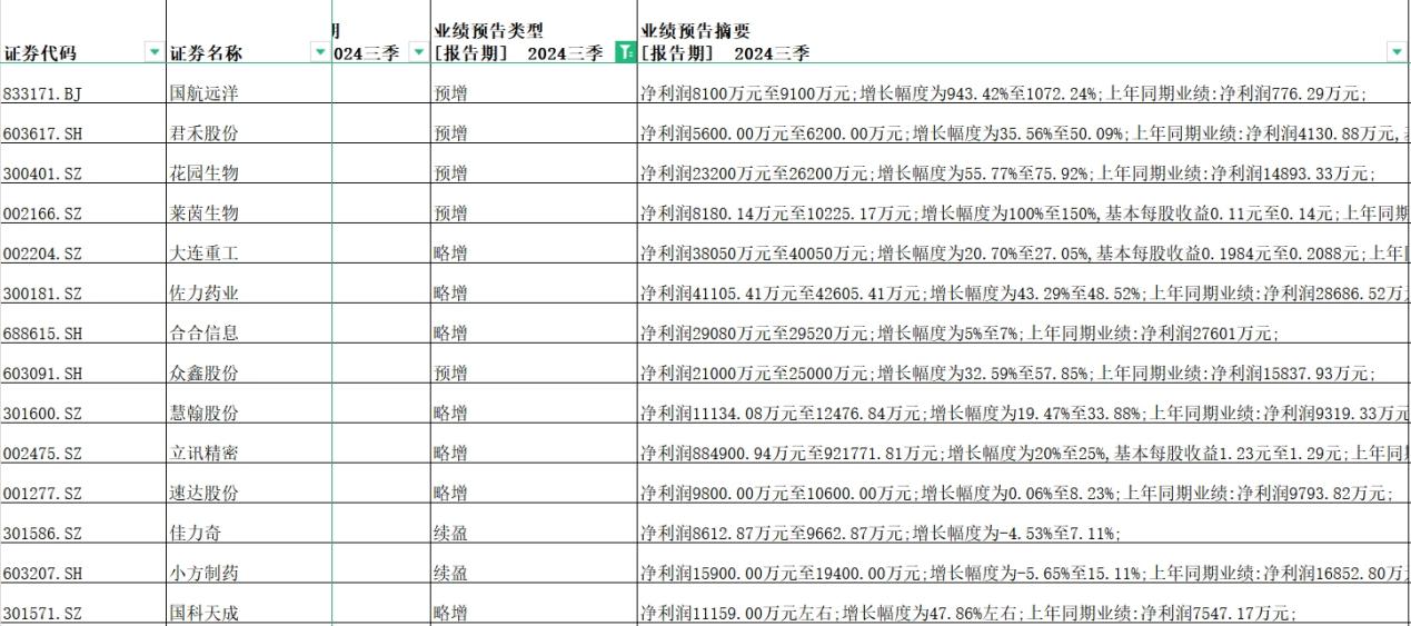 三季度净利润涨幅前三分别为国航远洋、莱茵生物、花园生物,净利润涨幅分别为943.42%至1072.24%、100%至150%、55.77%至75.92%。