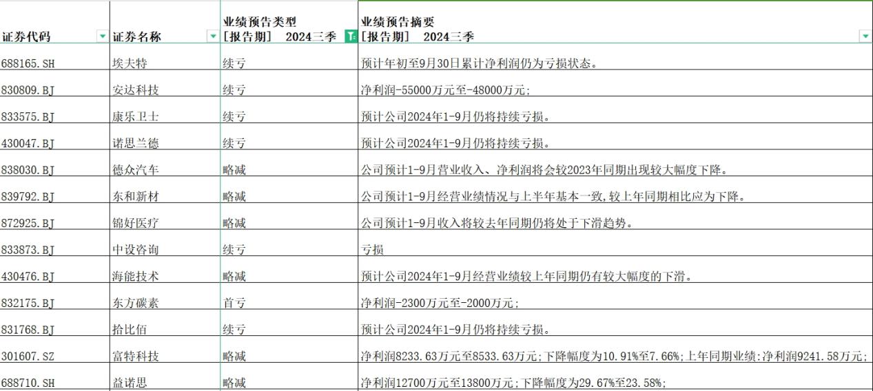 同花顺数据显示,德众汽车、东和新材、锦好医疗、海能技术、富特科技、益诺思三季度业绩略减。其中,德众汽车与海能技术在报告中指出,预计公司2024年1-9月经营业绩较上年同期仍有较大幅度下滑,但并未给出具体数据。东和新材与锦好医疗则表示,公司预计1-9月收入将较去年同期仍将处于下滑趋势。