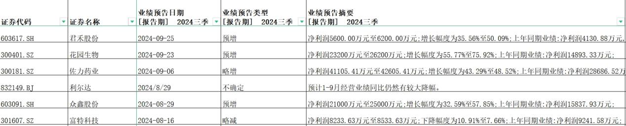 其中,君禾股份三季度净利润5600.00万元至6200.00万元,增长幅度为35.56%至50.09%;花园生物净利润23200万元至26200万元,增长幅度为55.77%至75.92%;佐力药业净利润41105.41万元至42605.41万元,增长幅度为43.29%至48.52%;众鑫股份净利润21000万元至25000万元;增长幅度为32.59%至57.85%。