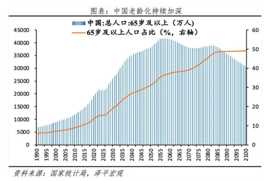 根据育娲人口《中国人口预测报告2023》,预计中国在2030年左右进入占比超20%的超级老龄化社会,之后持续快速上升至2060年的约 37.4%,企稳一段后将再度上升至2080年及之后的46%左右,届时中国8亿总人口中近一半是老年人。