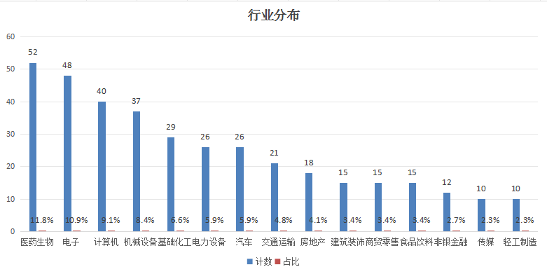 按申万一级行业划分,441家A股上市公司中,有52家属于生物医药行业,占比11.8%。其次是医药生物、电子、计算机、机械设备,分别拥有48家、40家、37家。