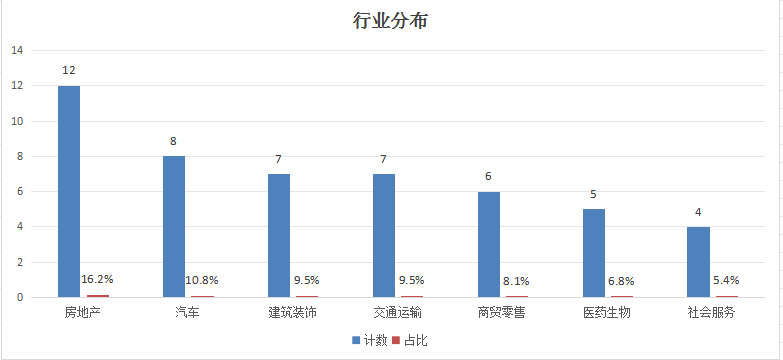 按申万一级行业划分,74家只概念股中,有12家属于房地产,占比16.2%;其次是汽车、建筑装饰、交通运输,分别拥有8家、7家、7家。