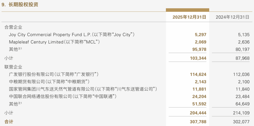 这一结构也暴露了一个潜在风险:如果剔除广发银行的收益贡献,长期股权投资的其他项目能否支撑起这一板块的价值?中国联通、川气东送管道等项目的收益贡献相对有限,而部分不动产相关投资可能还面临减值压力。
