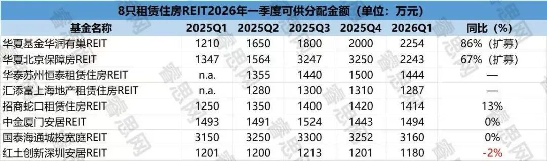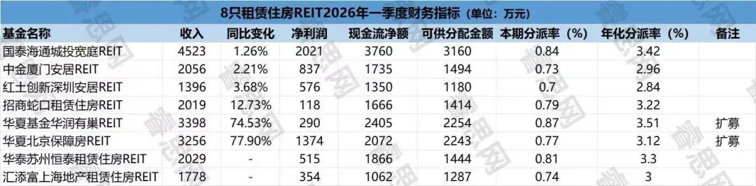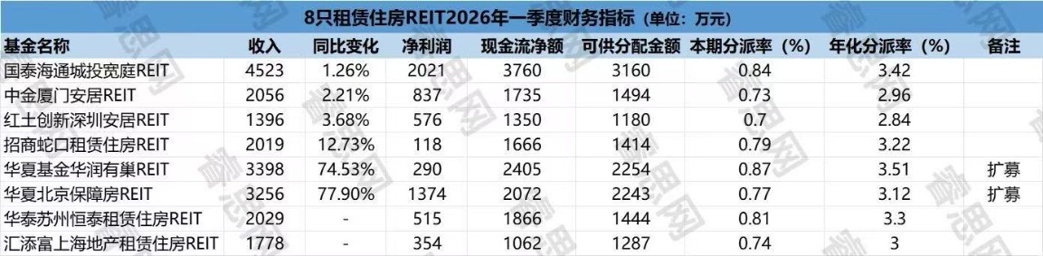 从财务数据看,扩募的红利非常直观。华夏北京保障房、华夏华润有巢这两只一季度完成扩募并表的标的,收入同比分别大涨77.90%、74.53%,规模效应一下子就体现在报表上。尤其是华润有巢,纳入马桥项目后,一季度收入直接冲到3398万元,可供分配金额也达到2254万元,年化分派率3.51%,直接跻身板块前列。北京保障房扩募后,现金流净额2072万元、可供分配金额2243万元,同样实现了质的跃升。
