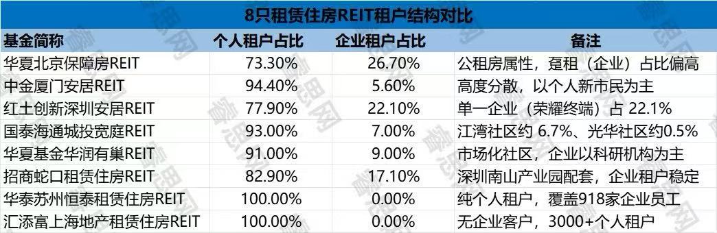 租户结构上,两类模式的差异,后续风险点也不一样。华泰苏州恒泰、汇添富上海地产,全是个人租户,而且高度分散,基本不用担心集中退租的问题。但红土深圳安居、华夏北京保障房、招商蛇口,都有一定比例的企业或机构配租租户,尤其是红土深圳安居,百泉阁项目单一企业租户的面积占比达到45.43%。虽说这类配租都是住建部门统一安排的,履约情况目前看也不错,但这种集中度,后续还是得重点盯着——万一企业经营出点问题,对项目的影响会很直接。国泰上海宽庭、华润有巢的企业租户占比则控制在10%以内,结构相对均衡。