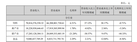 新希望其他业务也处于微利状态。饲料业务毛利率为6.51%,禽产业毛利率仅为1.70%,食品毛利率为2.29%。