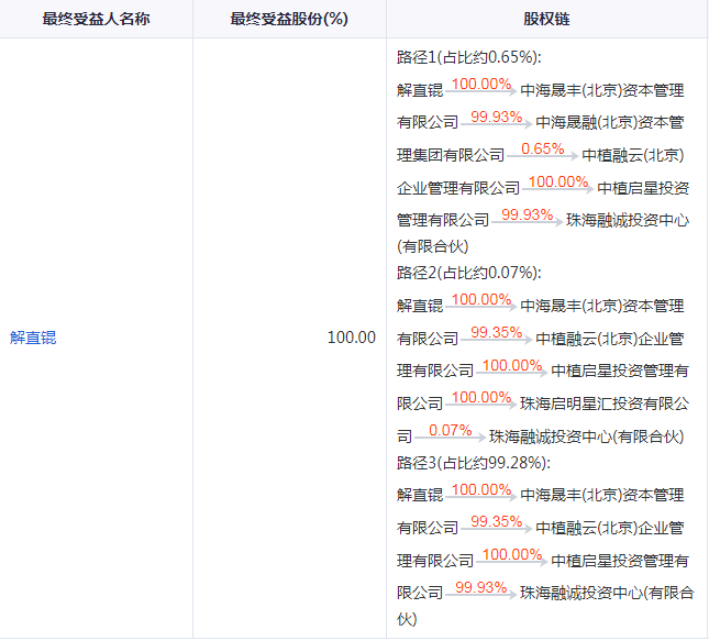 通过股权链,珠海融诚投资中心(有限合伙)最终受益人为解直锟,最终受益股份100%。
