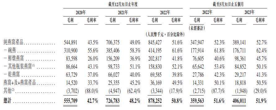 2020年、2021年、2022年以及2023年前5月,“碗燕”相关产品收入分别为5.59亿、6.61亿、6.72亿、2.88亿及2.83亿。产品毛利率由2020年的55.6%增长至2022年的61.6%,2023年前5月达到62.4%。