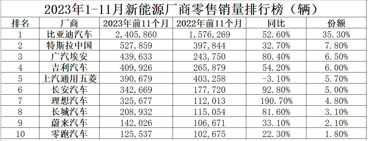 从行业整体看,根据乘联会公布的截至去年11月的新能源车厂商零售销量数据,排名前十的有比亚迪汽车、特斯拉中国、广汽埃安、吉利汽车、上汽通用五菱、长安汽车、理想汽车、长城汽车、蔚来汽车、零跑汽车。其中比亚迪汽车的份额最高,是唯一超过35%的品牌。从同比数据看,2023年前11个月,只有上汽通用五菱的零售销量是同比下降的,其余品牌销量皆上涨。