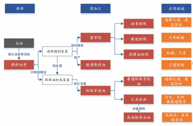 历经十余年的发展,公司现具有年综合处理近百万吨的生产能力,主要产品为重芳烃衍生品、白油、基础油、油剂、橡胶增塑剂、沥青等系列。其中,重芳烃、环保芳烃油在橡胶、沥青、交通运输等行业用途广泛。近年来,公司积极开展各类产品在新能源、新材料等高价值领域的应用拓展。