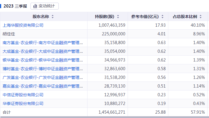 截至目前,胡佳佳持有公司2.25亿股,占公司总股本的8.96%。