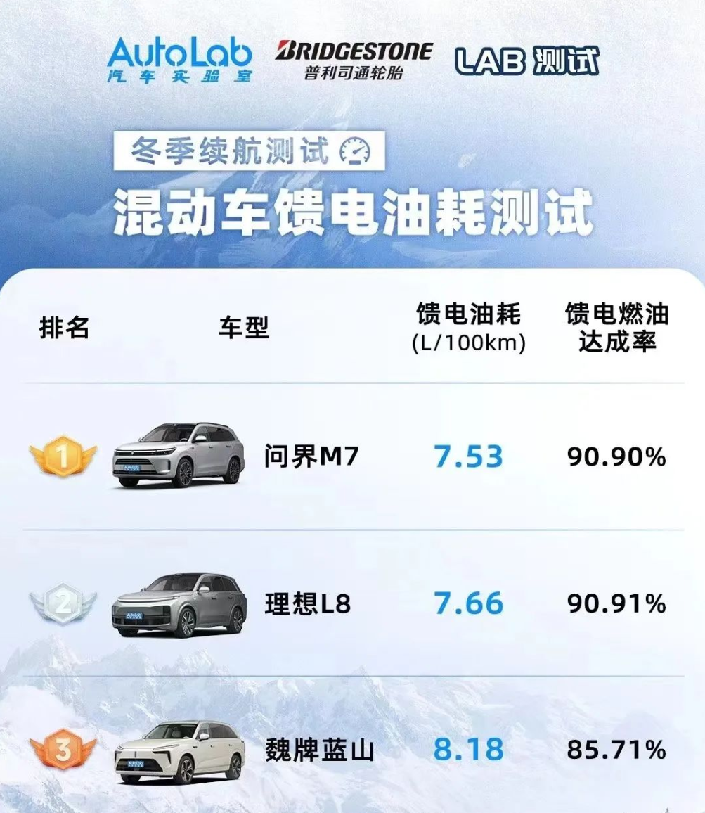 在车主关心的续航方面,问界新M7表现亮眼。根据AITO问界官微提供的信息,在AutoLab刚刚结束的冬季测试中,问界新M7在馈电油耗测试、混动模式综合油耗测试、极寒环境空调制热效率测试中均排名第一!