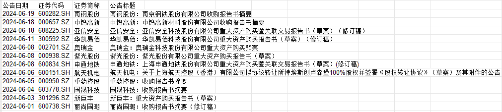 同花顺数据显示,6月以来,披露股权收购和资产重组公告的上市公司近200家。其中,有三分之一涉及交易进展公告,有16家涉及交易完成公告,有5家涉及交易终止公告,首次披露交易报告书的有12家。