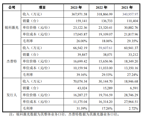 相较之下,公司光纤激光器营业收入保持更快增长,营业收入由2021年的1.89亿元增长至2023年的超7亿元,占营业收入的比例也提升至64.14%。