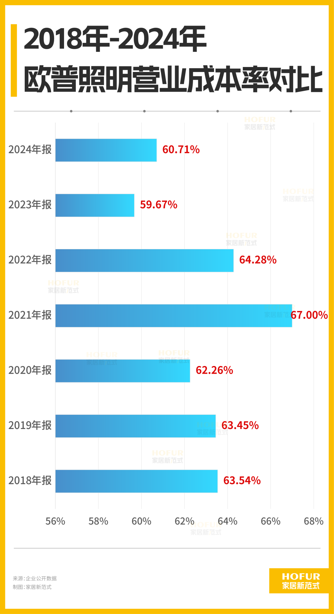 家居新范式观察到,欧普照明的盈利能力坚挺,其中一大因素是单位生产成本减少。2024年,欧普照明的营业成本率为60.71%,较2021年减少6.28个百分点,较2018年减少2.83个百分点。