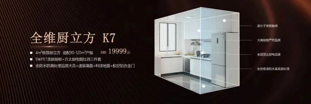 全维厨立方K7则通过“天地门墙柜燃电”一体化设计,将七大独立品类整合为标准化套餐,实现从空间规划到功能实现、从基础硬装到智能设备的全维度覆盖,就像把厨房“打包”一样、一站式定制,让消费者省心、安心。