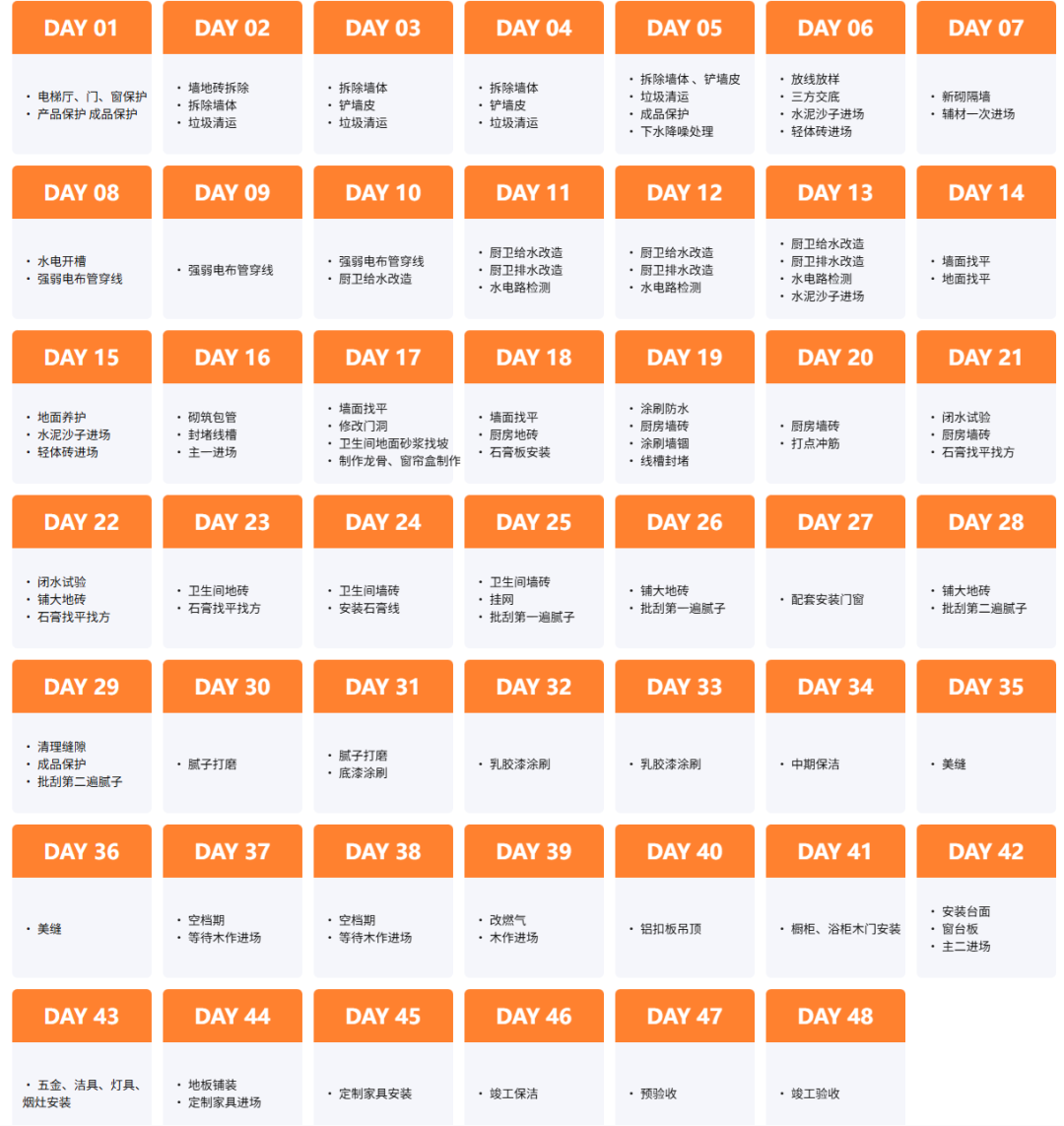 爱空间还提出“48天标准工期”,规划好每一天的施工进度,宣称“标准化工艺100%落地”,使得施工流程较为透明化。