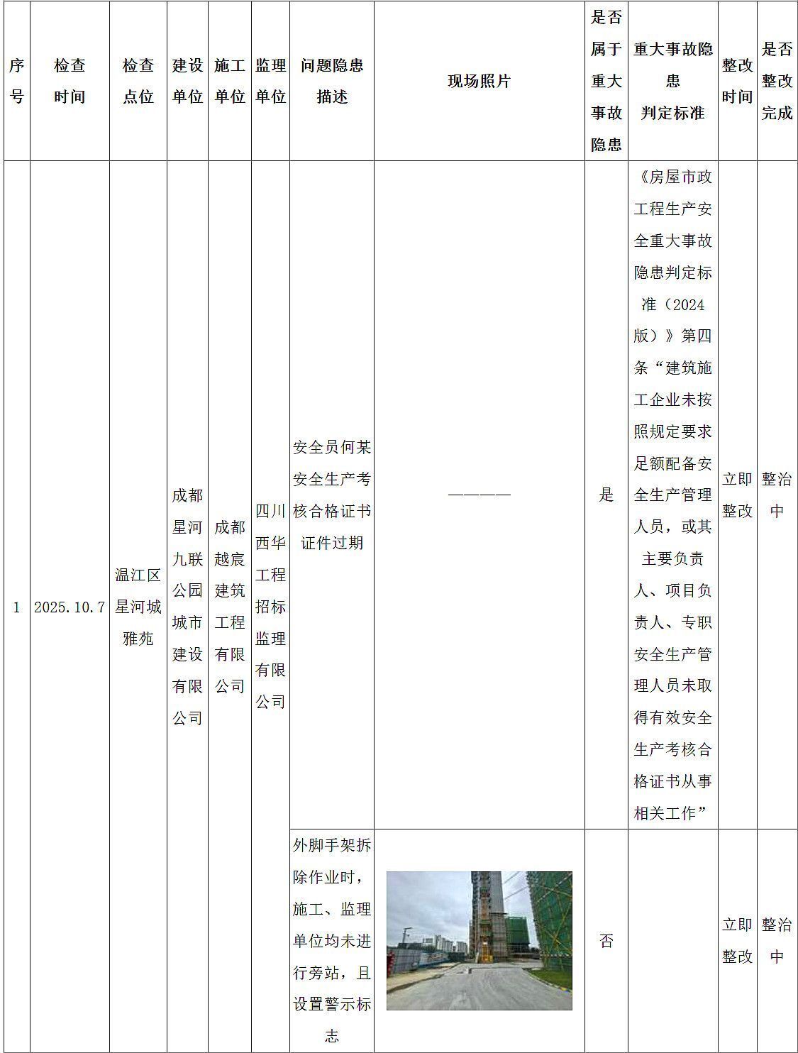 近期,成都市区两级住建部门采取现场检查、线上巡查等方式,对施工现场、既有建筑等方面进行了检查,并将近期发现的典型安全隐患问题进行通报。温江区星河城雅苑项目因存在安全生产隐患被通报。