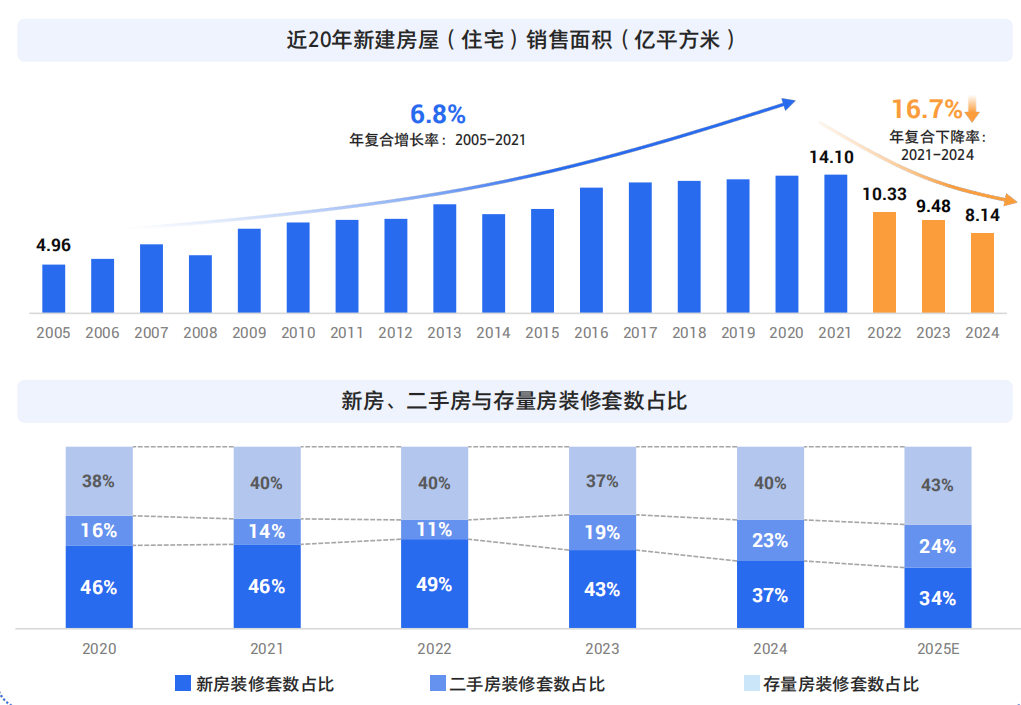 市场环境变迁倒逼装企重构增长逻辑。如今的家装市场,早已不是十年前那个“有房就装”的黄金时代。《指南》里提到一个数据,近3年新建住宅销售面积年复合下降 16.7% ,这意味着家装市场正处在“狼多肉少”的存量竞争阶段。