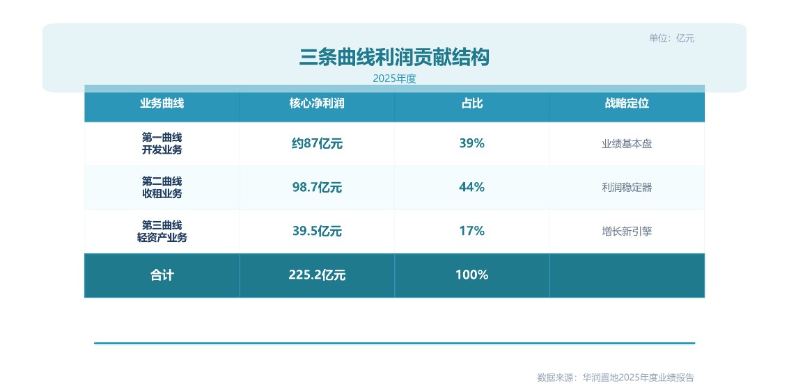 答案藏在业务结构的深层变革中。2025年,华润置地经常性业务核心净利润达116.5亿元,占核心净利润比重51.8%——这是公司历史上首次实现"利润结构过半"。意味着即便房地产开发业务完全停滞,公司仍能维持盈利的基本盘。