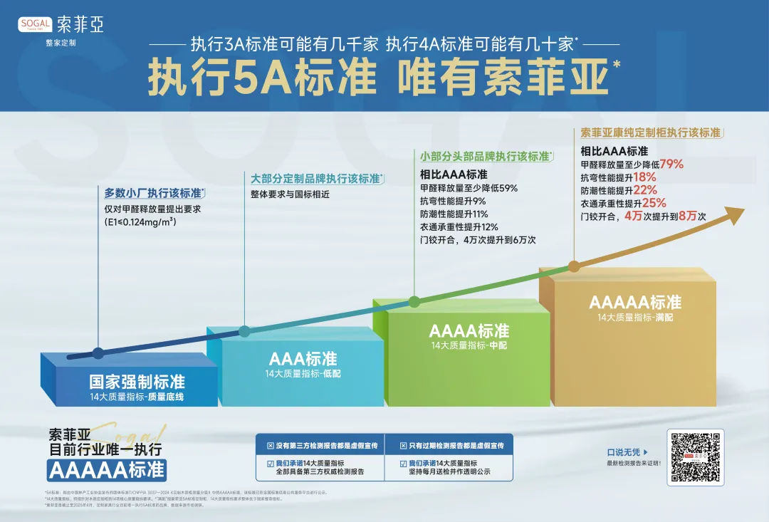 第一步,是标准。索菲亚联合中国林科院等18家机构起草并率先执行“中国定制家5A标准”(标准是中国林产工业协会发布),推动行业品质升级。