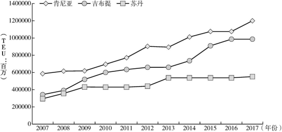 图1 吉布提、肯尼亚、苏丹港口的年吞吐量(TEU)变化