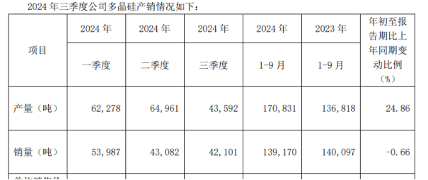 就产销端而言,不难看出大全能源第三季度减产的力度。前三季度,大全能源的产量为17.08万吨,同比增长24.86%。其中Q3产量为4.36万吨,环比Q2减少超三成,Q1及Q2的产量约为6.23万吨、6.5万吨。大全能源预计第四季度多晶硅产量在3.1万吨至3.4万吨,今年全年预期产量为20万吨至21万吨。