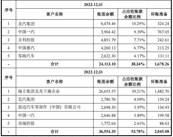 截至2022年至2024年末,公司应收账款账面价值分别为62,196.05万元、57,595.06万元和59,899.65万元,占资产总额的比例分别为27.49%、21.95%和21.11%,应收账款余额前五名客户情况如下: