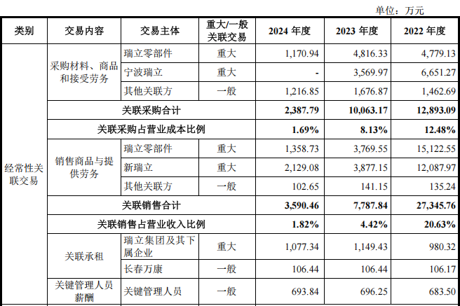 关联采购方面,2022年至2024年,发行人向瑞立零部件采购零部件及加工服务金额分别为4,779.13万元、4,816.33万元和1,170.94万元,占各期营业成本的比重分别为4.62%、3.89%和0.83%。