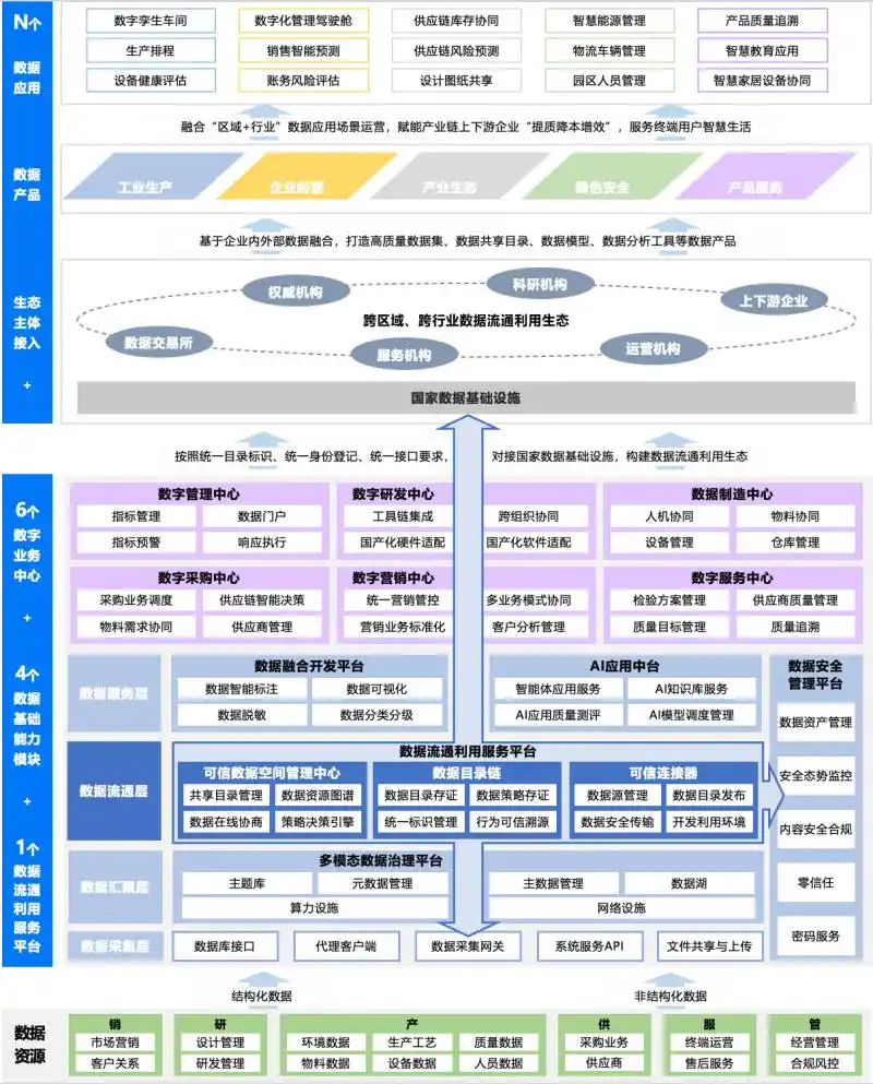其主要功能架构包含1个数据流通利用服务平台、4个数据基础能力模块、6个数字业务中心,充分发挥工业制造领域产业链、供应链上下游企业数字化转型中数据要素的重要作用。