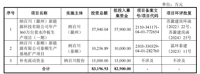 需要注意的是,在纳百川招股书申报稿当中,其募资金额为82900万元,分别用于“纳百川(滁州)新能源科技有限公司年产360万台套水冷板生产项目(一期)”“纳百川(泰顺)新能源有限公司泰顺生产基地扩产项目”以及补流。