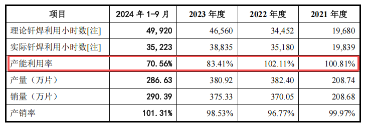 招股书显示,2021年至2024年,纳百川的产能利用率处于逐年降低态势。2021年为100.81%,2022年为102.11%,2023年降至83.41%,2024年继续下降至70.56%。今年一季度虽然有所回升,但也只有88.31%的水平。