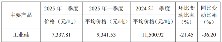 究其原因,Q2因工业硅原材料价格走弱、成本支撑下滑,叠加贸易摩擦引发宏观悲观情绪,价格逐步跌破历史低位。Q2的工业硅价格为7337.81元/吨,Q1及2024年Q2的均价分别为9341.53元/吨、11500.92元/吨,环比、同比分别下滑21.45%、36.2%。Q2工业硅销量为21.46万吨,环比减少了17.4%,出现量价齐跌的情形。
