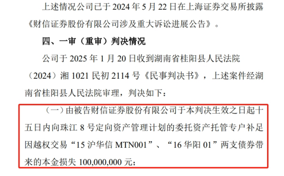 根据财信证券公告显示,公司于2025年1月20日收到湖南省桂阳县人民法院(2024)湘1021民初2114号《民事判决书》,法院重审判决财信证券需向珠江8号定向资产管理计划的委托资产托管专户补足因越权交易“15沪华信MTN001”、“16华阳01”两支债券带来的本金损失1亿元、利息及交易费用损失。
