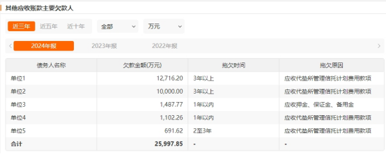 值得一提的是,截至2024年末,五矿信托其他应收账款主要欠款人中,有两家单位欠款金额超过1亿元,千万级的欠款单位也较上一年有所增加,而拖欠原因主要是应收代垫所管理信托计划费用款项和应收押金、保证金、备用金等。