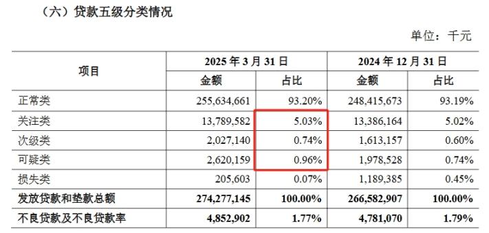 数据显示,截至2025一季度末,次级类贷款占比从2024年末的0.60%跃升至0.74%,可疑类占比从0.74%飙升至0.96%,关注类占比也微升至5.03%。尽管不良贷款率因损失类规模压降微降至1.77%,但五级分类的结构恶化,传递出欠佳的信号。