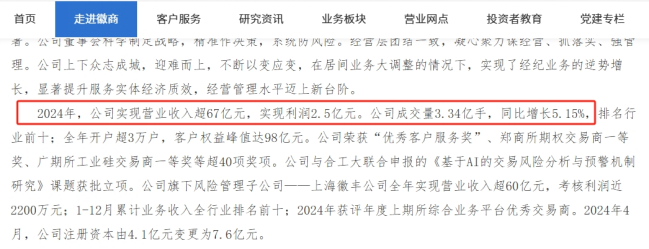 频繁的监管处罚对徽商期货的市场表现与经营业绩是否存在影响?根据徽商期货官网披露的经营数据来看,2024年,公司实现营业收入超67亿元,实现利润2.5亿元。公司成交量3.34亿手,同比增长5.15%,排名行业前十;全年开户超3万户,客户权益峰值达98亿元。