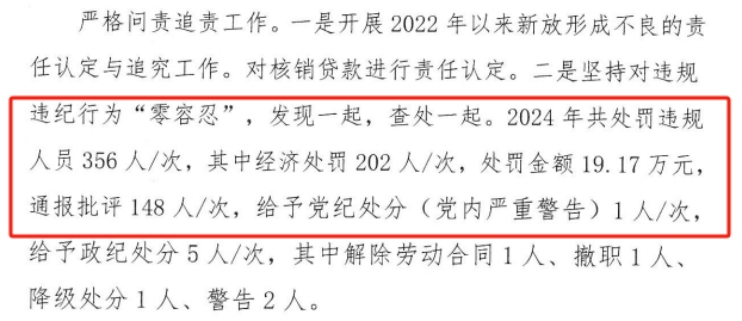 年报显示,2024年,该行共处罚违规人员356人次,其中经济处罚202人次,处罚金额19.17万元;通报批评148人次;给予党纪处分1人次(党内严重警告);政纪处分5人次,包括解除劳动合同1人、撤职1人、降级处分1人、警告2人。