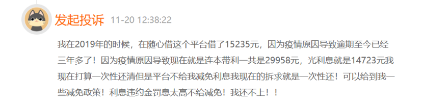 11月20日,有用户说在随星借平台借了15235元,因为疫情原因逾期后,连本带利已经涨到近30000元,利息都快接近本金。该用户我打算一次性还清但是平台不予以减免利息。对此,该用户现在的诉求就是一次性还款。