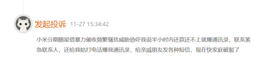 11月27日,有用户投诉道:小米分期随星借存在暴力催收、频繁骚扰、威胁恐吓的乱象。该用户被告知半小时内还款还不上就爆通讯录,联系紧急联系人,结果真的对其通讯录好友逐个联系,现在快“家庭破裂”了。